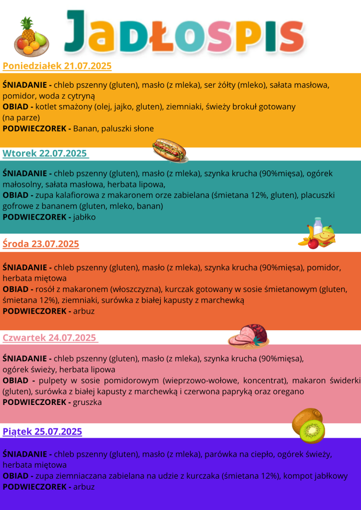 Jadłospis 21.07 do 25.07 Post author:Karolina Piątkowska Post published:21 lipca, 2025 Post category:jadłospis Post comments:0 Komentarzy Może ci się spodobać również JADŁOSPIS 22.04 DO 25.04 18 kwietnia, 2025 JADŁOSPIS 07.04.2025 DO 11.04.2025 7 kwietnia, 2025 Jadłospis od 23.06 do 27.06 23 czerwca, 2025 Dodaj komentarz Anuluj pisanie odpowiedziCommentEnter your name or username to comment Enter your email address to comment Enter your website URL (optional) Zapamiętaj moje dane w tej przeglądarce podczas pisania kolejnych komentarzy.