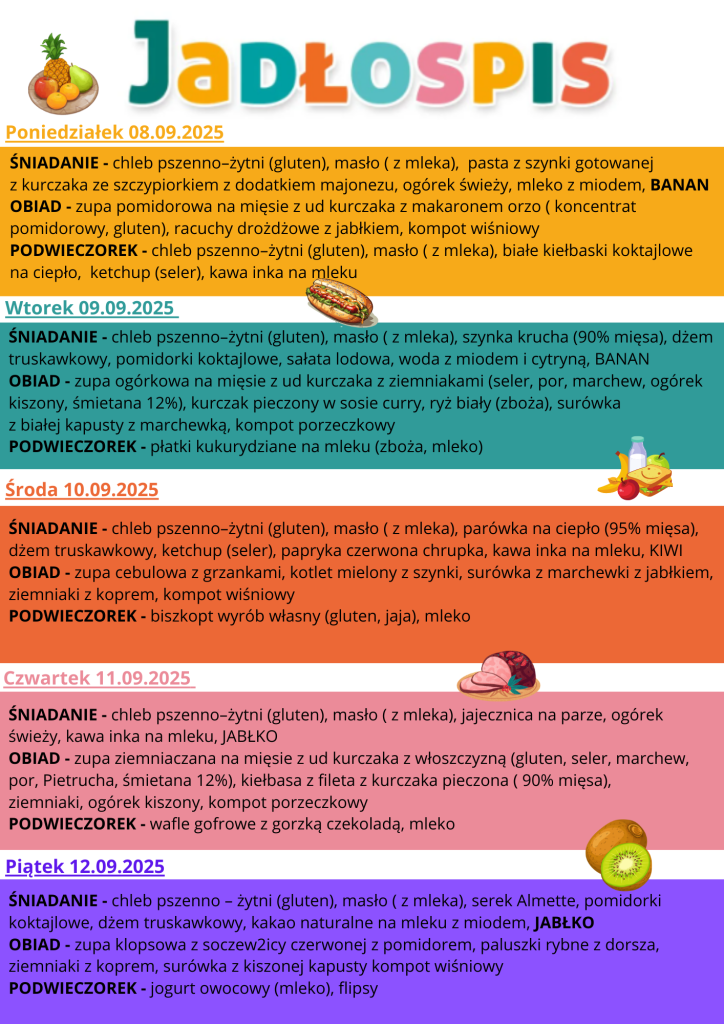 Jadłospis od 08.09 do 12.09 Post author:Karolina Piątkowska Post published:5 września, 2025 Post category:jadłospis Post comments:0 Komentarzy Może ci się spodobać również Jadłospis od 26.01 do 30.01 28 stycznia, 2026 Jadłospis od 9.03 do 13.03 9 marca, 2026 JADŁOSPIS 31.03.2025 DO 04.04.2025 31 marca, 2025 Dodaj komentarz Anuluj pisanie odpowiedziCommentEnter your name or username to comment Enter your email address to comment Enter your website URL (optional) Zapamiętaj moje dane w tej przeglądarce podczas pisania kolejnych komentarzy.