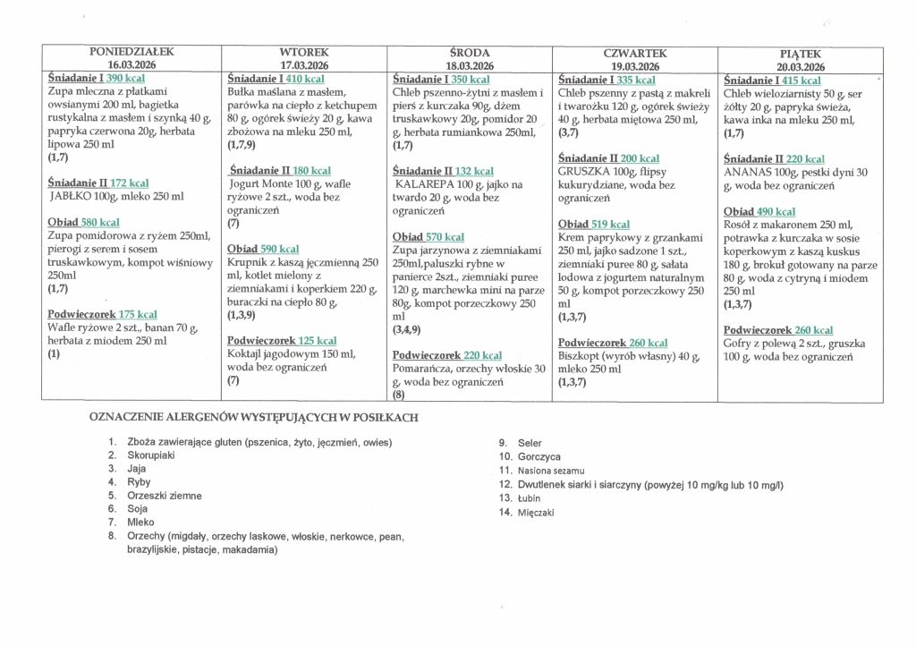Jadłospis od 16.03 do 20.03