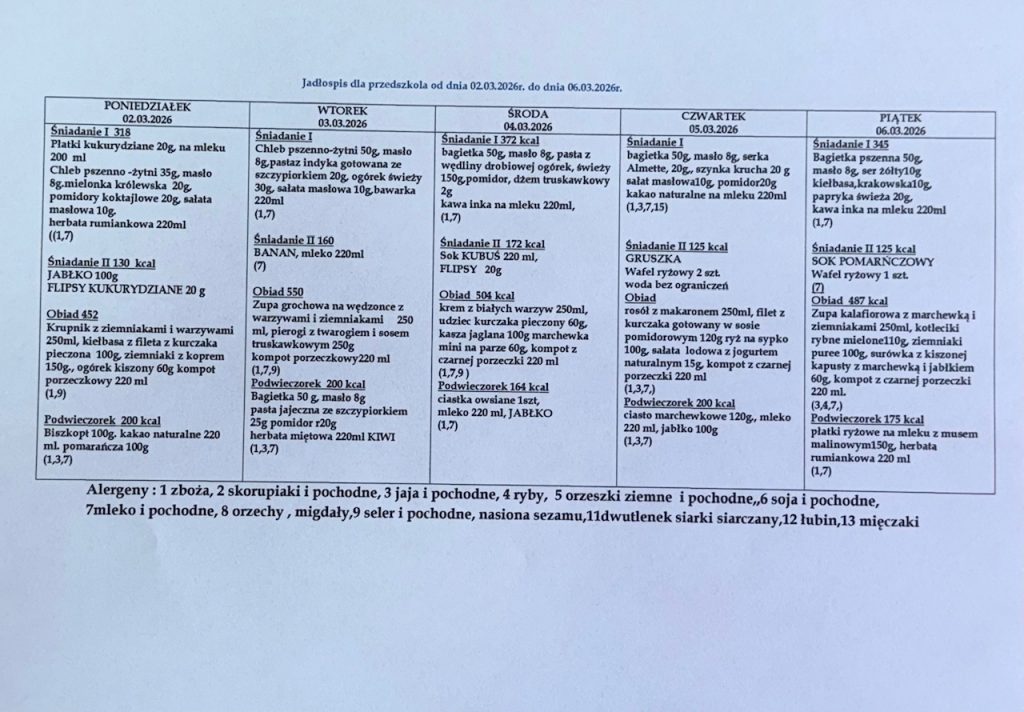 Jadłospis od 2.03 do 6.03 Post author:Karolina Piątkowska Post published:2 marca, 2026 Post category:jadłospis Post comments:0 Komentarzy Może ci się spodobać również Jadłospis od 20.10 do 24.10 20 października, 2025 Jadłospis 07.07 do 11.07 7 lipca, 2025 JADŁOSPIS 07.04.2025 DO 11.04.2025 7 kwietnia, 2025 Dodaj komentarz Anuluj pisanie odpowiedziCommentEnter your name or username to comment Enter your email address to comment Enter your website URL (optional) Zapamiętaj moje dane w tej przeglądarce podczas pisania kolejnych komentarzy.
